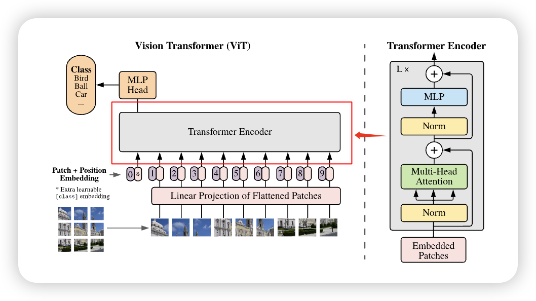 - 分类头(MLP Head): 最终通过一个MLP分类头输出图像所属的类别。