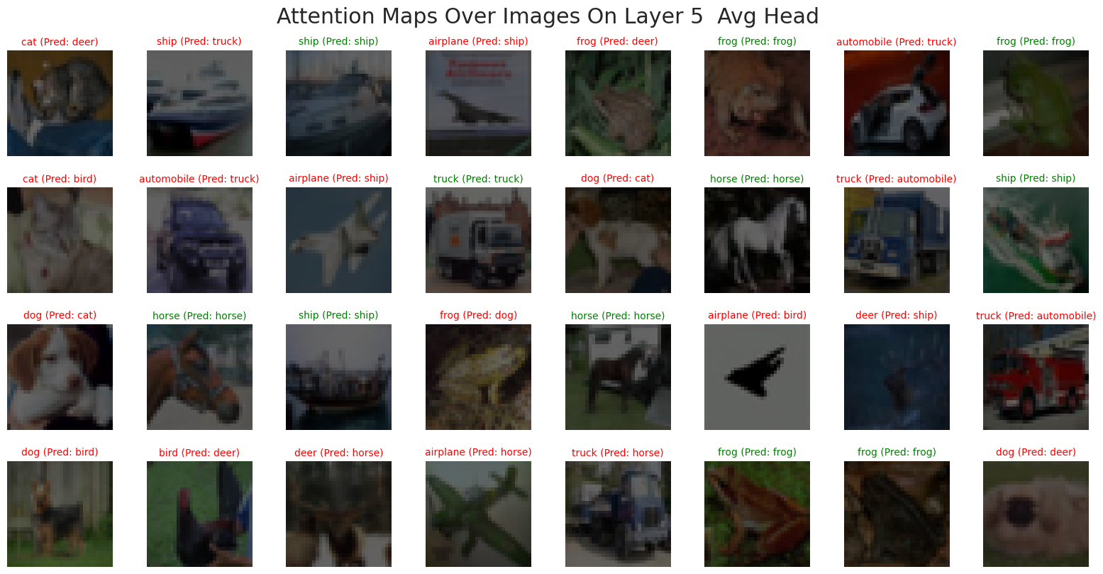 f"Attention Maps Over Images On Layer {TARGET_LAYER} {'Head ' + str(HEAD) if HEAD >= 0 else 'Avg Head'}",