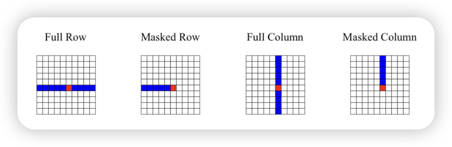 在处理 图像或视频 这类高维输入时,如果直接对所有像素做 全局 self-attention,复杂度是 \(\mathcal{O}(H^2 W^2)\)当图像很大时,这个代价太高。 核心想法:把二维 attention 拆成两次一维 attention(沿着图像的两个“轴”分别做)。 1. Row-wise Attention(行注意力) • 沿着水平方向(宽度轴 W)做注意力,每一行的像素互相关注。 • 复杂度:\(\mathcal{O}(H \cdot W^2)\)。 2. Column-wise Attention(列注意力) • 沿着垂直方向(高度轴 H)做注意力,每一列的像素互相关注。 • 复杂度: \(\mathcal{O}(W \cdot H^2)\)。