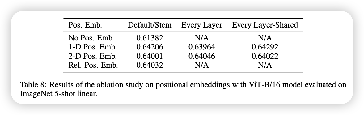 为什么ViT要用Learned Position Embedding呢?在ViT这篇文章中,他们尝试过不同的Position Embedding,比如: