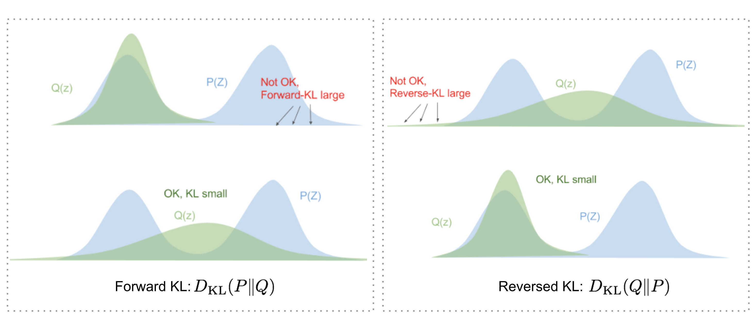 需要注意的一个点是,KL-Divergence是不对称的, \[ D_{KL}(Q \| P) \neq D_{KL}(P \| Q) \]