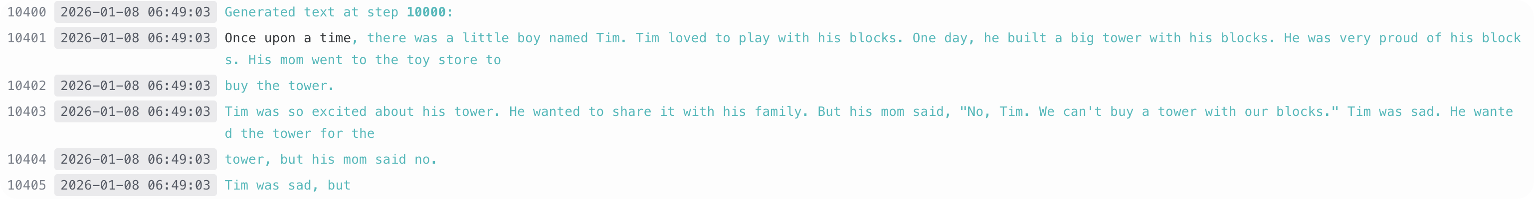 我们可以看到,生成的句子,有一定的连贯性, 但是故事并不是完整的,且有一定的逻辑混乱。这是因为模型规模较小,训练步数有限,无法完全捕捉到复杂的语言结构和故事情节。我们可以通过以下几种方式来提升生成效果: