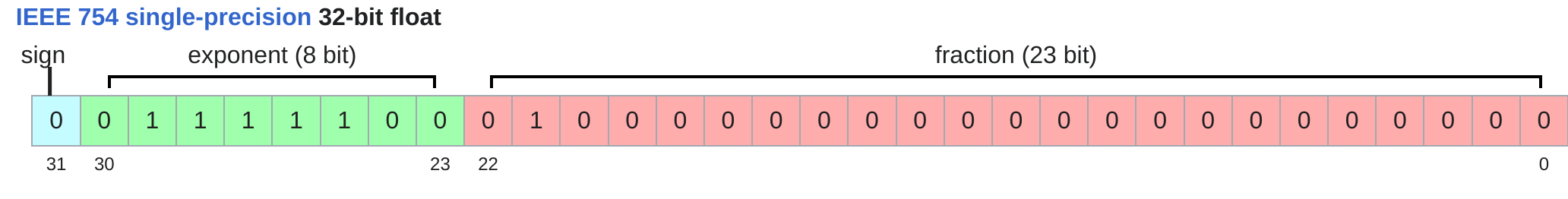 浮点数的值可以通过以下公式计算: \[ number = (-1)^{Sign} \times Base^{(Exponent - Bias)} \times 1.Mantissa \tag{1}\]