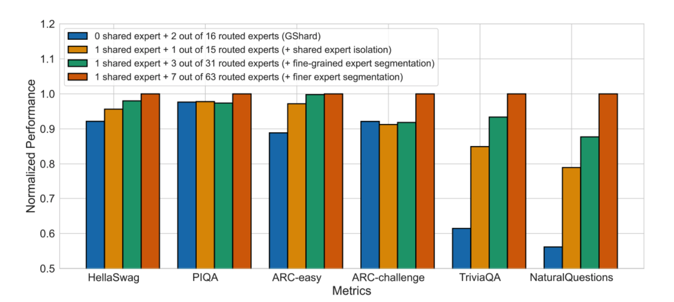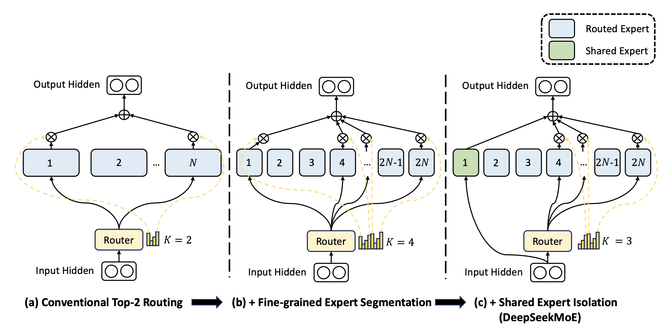 在MoE模型中,Experts是多个独立的FFN Layer,每个Expert负责处理一部分token。每个Expert通常由一个前馈神经网络(Feed-Forward Neural Network, FFN)组成,结构与传统的Transformer中的FFN类似,但参数是独立的。那么,Experts的中间层的维度应该如何选择呢? 一般来说,Experts的中间层维度通常设置为输入维度的4倍(即\(4d_{model}\)),和传统的FFN Layer保持一致。这是因为较大的中间层维度可以提升模型的表达能力,从而提升整体性能。 但是,在Figure 7中,我们看到DeepSeek介绍了Fine-Grained Experts的概念,即通过增加Experts的数量,同时减少每个Expert的中间层维度,从而提升模型的表达能力。在DeepSeek MoE 中(Dai et al. 2024), 每个Expert的中间层维度被设置为\(\frac{1}{4}d_{ff}\). 这样做的好处是,可以让模型拥有更多的专家,从而提升模型的多样性和表达能力。