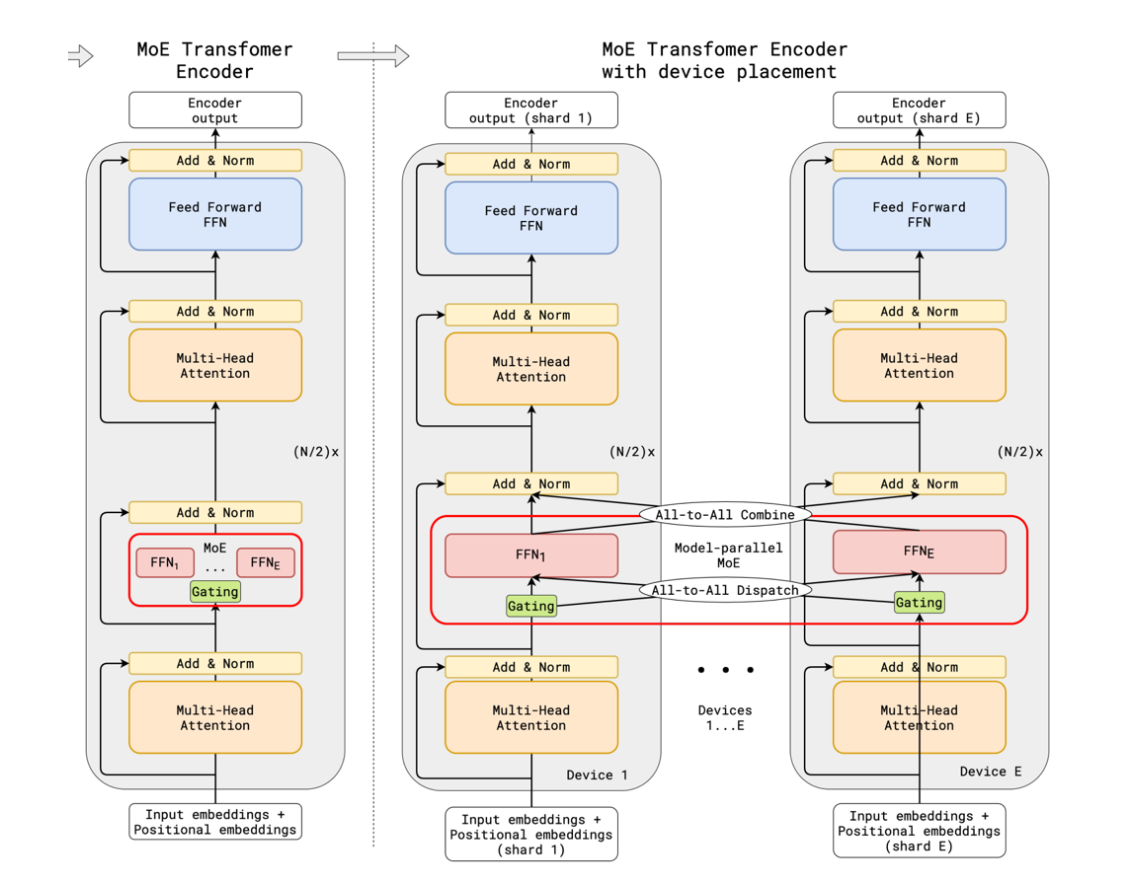并且,由于MoE有不同的Experts, 并且每个Expert可以独立训练,这使得MoE模型在分布式训练中更具优势。我们可以将不同的Experts分配到不同的计算节点上,从而更好地利用分布式计算资源,提高训练效率。