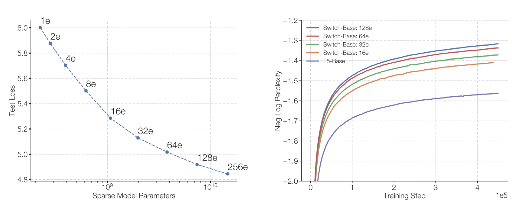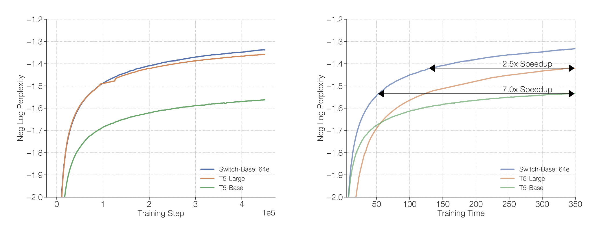 另外一个优点就是了, MoE所需的训练时间更短。如下图所示,在达到相同的perplexity水平下,MoE模型所需的训练时间明显少于Dense模型。