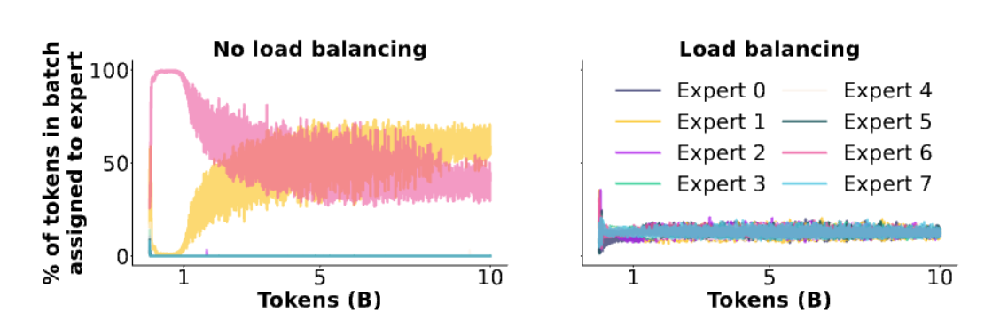 既然MoE训练的难点在于避免专家崩溃(Expert Collapse),那么一个直接的思路就是在主任务损失(Cross Entropy Loss)之外,添加一些辅助损失(Auxiliary Losses)来鼓励专家的均衡使用。这样做的好处是,可以直接引导模型学习更均衡的专家使用策略,从而提升整体性能。在这里,我们介绍两种常用的辅助损失:Load Balancing Loss 和 Z-Loss。