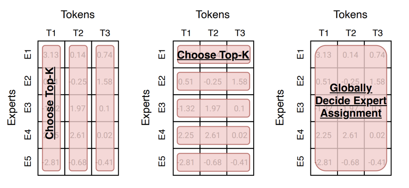 - Global assignment(全局分配):把 token–expert 匹配视作优化问题(如线性分配/最优传输),追求更均衡或更低通信成本