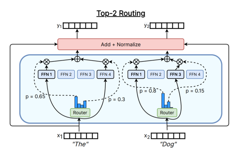 Combining Outputs:将专家的输出进行合并,得到最终的 token 表示。通常使用加权平均的方式: \[ h_i' = \sum_{j} g_{i,j} \text{Expert}_j(h_i) + h_i \tag{4}\] 其中,\(h_i'\) 是 token \(i\) 的最终表示,\(\text{Expert}_j(h_i)\) 是专家 \(j\) 对 token \(i\) 的处理结果, \(h_i\) 是 token \(i\) 的原始表示(Residual Connection), \(g_{i,j}\) 是 token \(i\) 对专家 \(j\) 的选择结果。