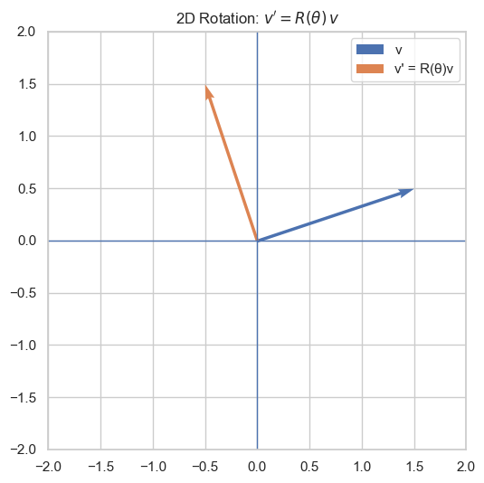 So, the new vector \(\mathbf{v}'\) be come: \[ \mathbf{v}' = R(\theta) \mathbf{v} = \begin{pmatrix} x\cos\theta - y\sin\theta \\ x\sin\theta + y\cos\theta \end{pmatrix} \] One of the good property of rotation matrix is that it is the orthonormal matrix(\(R^{\top}R = I\)), which means the length of original vector will not change after rotate: \[ \|Rv\|^2 = (Rv)^\top (Rv) = v^\top (R^\top R) v = v^\top I v = v^\top v = \|v\|^2 \]