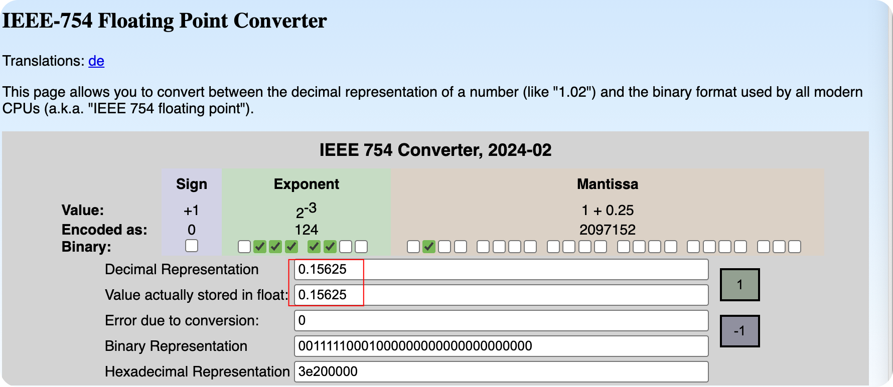 将这些值代入公式 Equation 1 中,可以计算出浮点数的值为: \[ number = (-1)^0 \times 2^{-3} \times 1.25 = 0.15625 \]