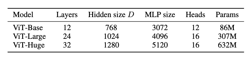 | Model Scaling (B/L/H) | Base/Large/Huge 三档参数与深度,patch 越小序列越长、计算更贵。 |