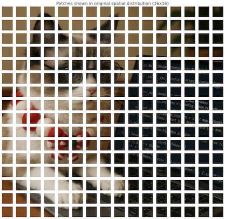有了Patch之后,我们就将图片从 \((H, W, C)\) 变成了 \((N, P, P, C)\), 其中 \(N = \frac{H \times W}{P^{2}}\)。 我们来看看代码怎么实现: