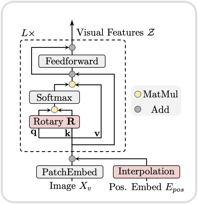 - 2D-RoPE (Rotary Position Embedding)(Su et al. 2023) to replace the original position encoding in ViT.